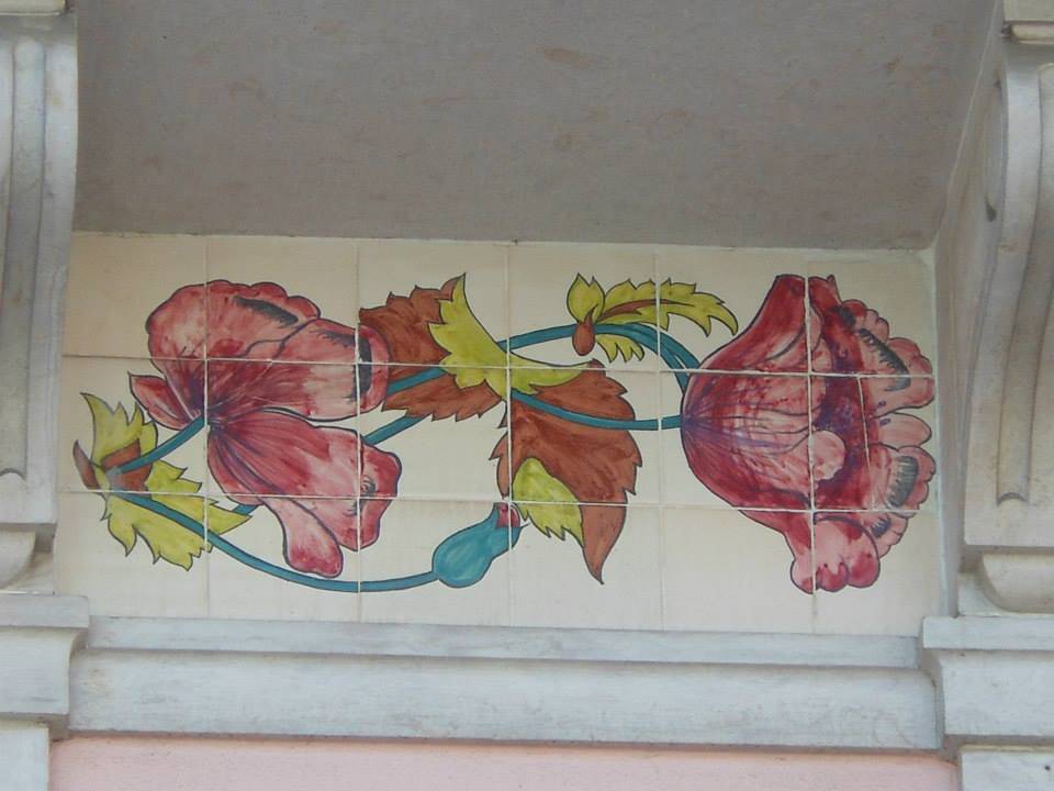 pintuira do vidro da fachada (ouro sobre fundo azul) com a